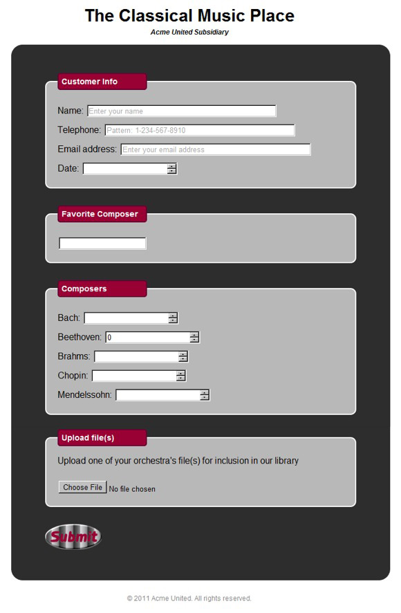 Bố cục của ví dụ biểu mẫu mà bạn sẽ phát triển được hiển thị trong Hình 1. Bạn sẽ phát triển ba vùng cho trang biểu mẫu này: vùng Header, vùng Form (Biểu mẫu), và vùng Footer. Vùng Header chứa các tiêu đề và phụ đề trang được bọc trong các thẻ. Ở dưới cùng của trang, vùng Footer có chứa thông tin bản quyền bên trong các thẻ. Tôi đã nói về việc xây dựng một vùng Header và một vùng Footer trong ví dụ được cung cấp trong phần 1 của loạt bài này: Nếu bạn chưa quen với các thẻ và, hãy tham khảo bài viết đó